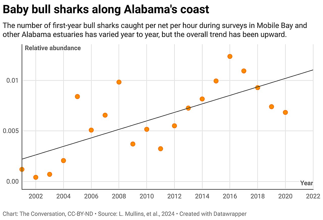 We study this iconic shark species, named for its stout body and matching disposition, along the Gulf of Mexico. Over the past two decades, we have documented a fivefold increase in baby bull sharks in Mobile Bay, Alabama, and a similar rise in several Texas estuaries, as our new study shows.