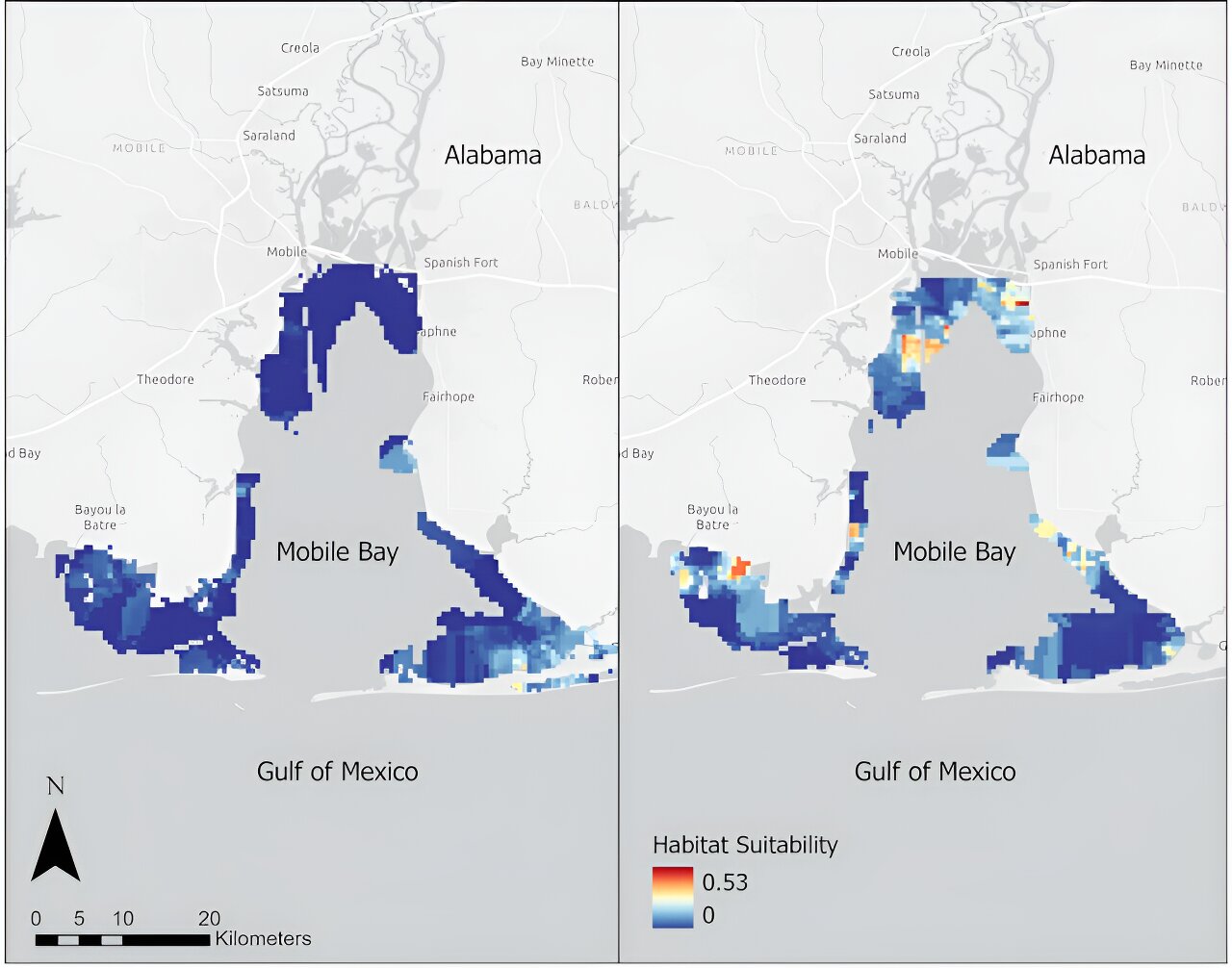 Two maps, from 2003 on the left and 2020 on the right, show how Mobile Bay’s habitat became more suitable for bull sharks over the two decades. Credit: Lindsay Mullins, et al., 2024