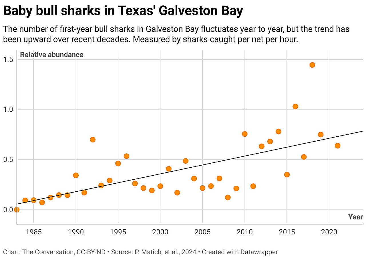 In Texas, young bull shark numbers have been increasing in estuaries like Galveston Bay and Sabine Lake over the past 40 years, particularly where rivers like the Trinity, Sabine and Neches intersect with these ecosystems. These areas may offer protection from predators, such as bigger sharks.