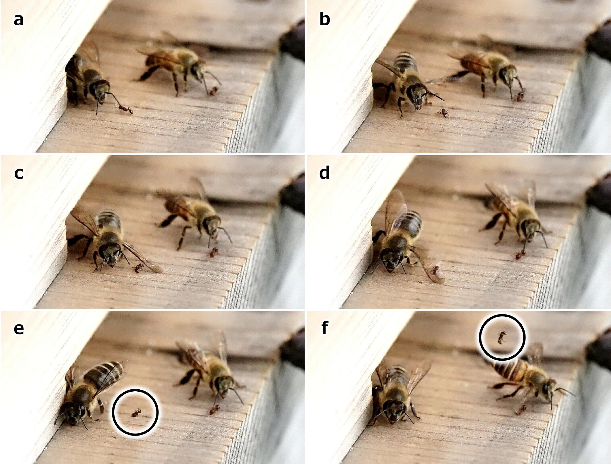 Series of photographs of a guard bee of the Japanese honey bee Apis cerana japonica (left) wing-slapping a Japanese pavement ant Tetramorium tsushimae. The bee on the left side of the photograph positions its body toward the ant (a, b). The bee then rotates its body while flapping its wings to slap the ant (c, d). The slapped ant is flicked away (e, f). Incidentally, the bee on the right positions its body toward another ant in (c–e), then rotates its body and is halfway through slapping the ant in (f). Credit: Ecology (2024). DOI: 10.1002/ecy.4372