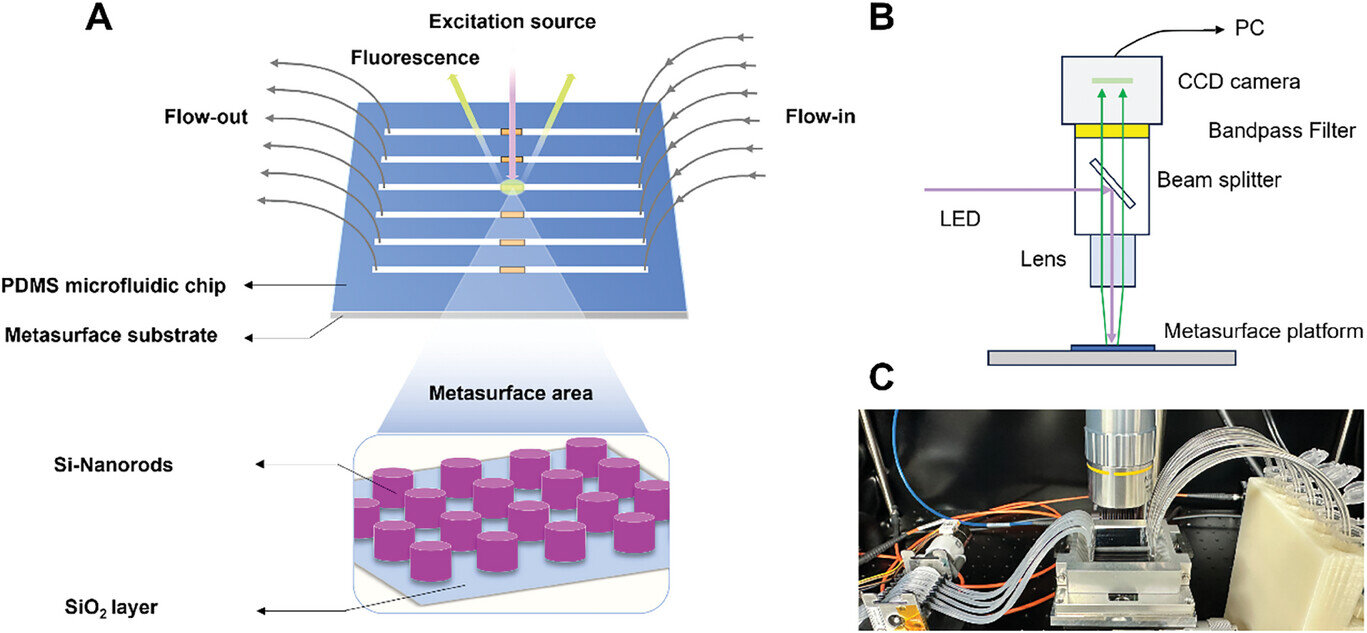 Mr. Hu says the new platform "integrates a microfluidic system and a metasurface substrate to enable analyte delivery and the monitoring/detecting AIE FL enhancement in real time with the outstanding characteristics of high throughput, good reusability and low reagent consumption."