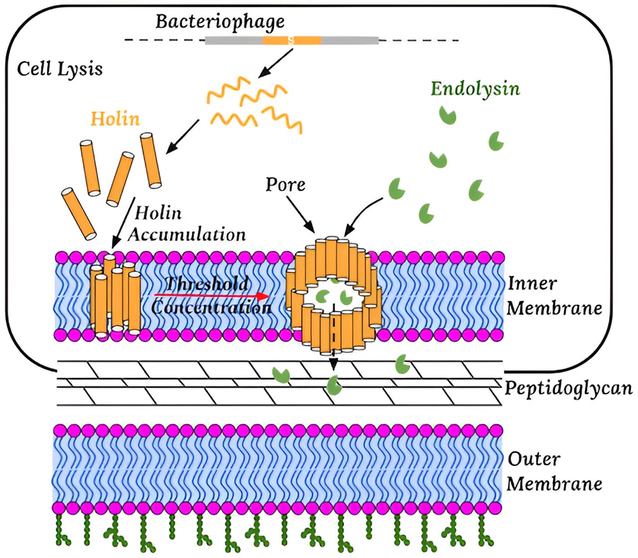The research team hypothesized that this precision results from the interplay between two random processes: the buildup of holin proteins, or small phage-encoded membrane proteins that permeabilize the host membrane at a programmed time, and the breaking of the cell membrane.